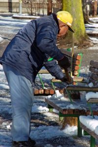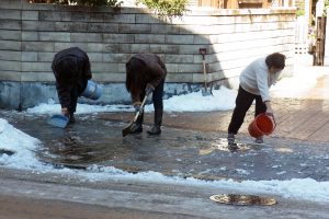手に手にスコップを持ち寄って雪かきです、