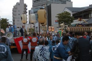 地口行灯に灯が点ると、各町内の神輿が板垣通りに