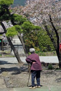 近所の婆様が腰に手を当てのんびりと桜を見上げていた、