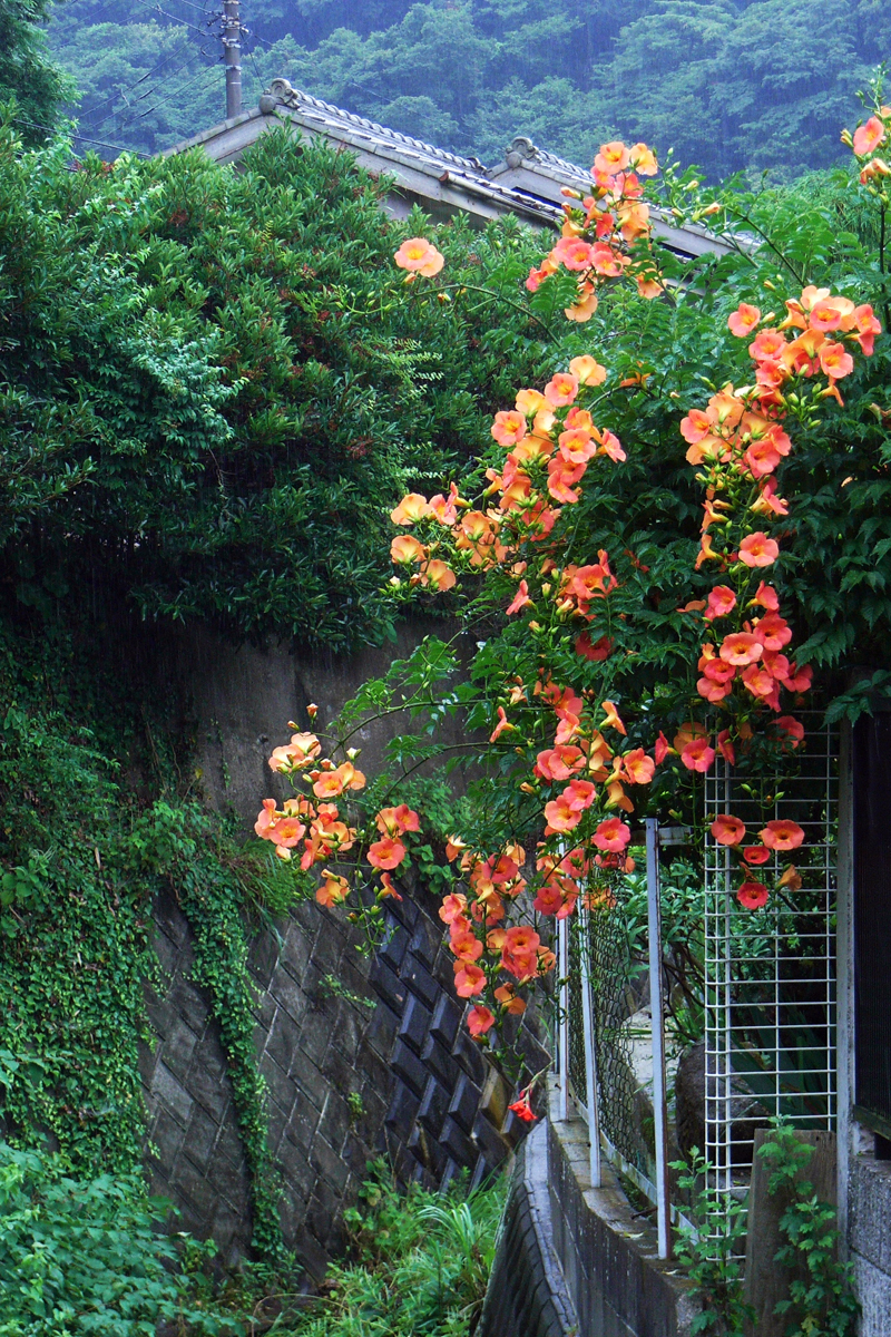 突き当たりの山門の軒下で無言の雨やどり・・・