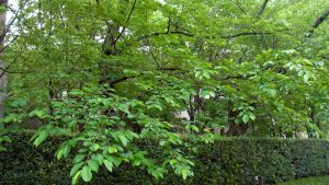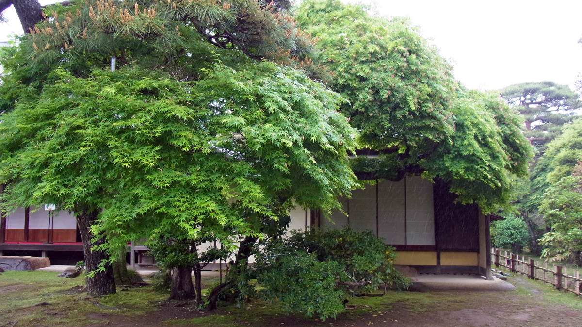 庭の木々は雨を含んでますます緑を輝かせている、