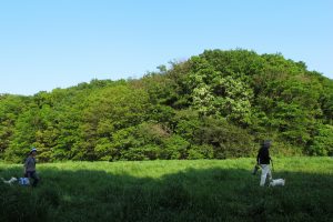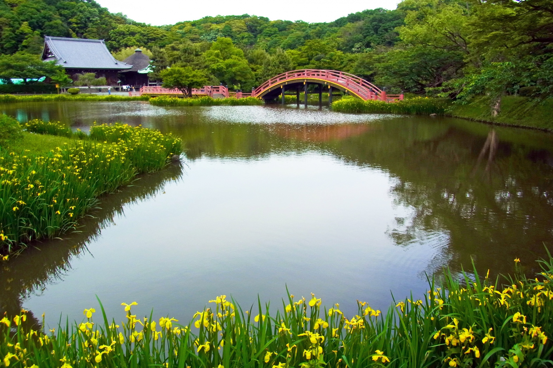 金沢、稲荷、日向の金沢三山を背景に阿字ヶ池の向こうに