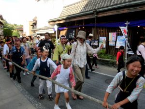 手児舞姿のかわいい女の子の先導で、長い綱をみんなで引き上げるのです、
