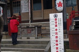 本堂の前で、彼女は長い祈りのあとで