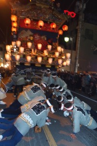 すれ違う屋台と屋台の隙間はほんのわずか、若衆達の山車曳き廻し
