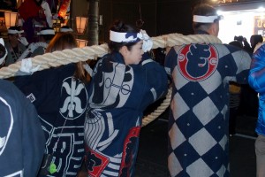 若衆たちに緊張が走ります、てこ棒にとり付いた若衆たちは渾身の力を