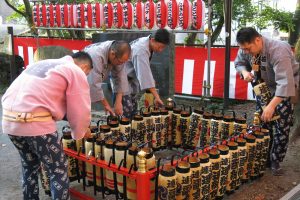 やがて若衆の一団が境内に現れるとその樽神輿を手分けして