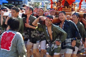 冬木町神輿に歓声をあげる、