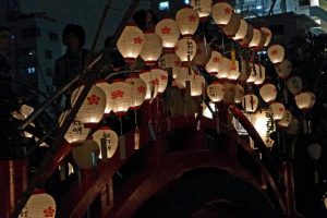 葛西囃子が流れると灯明の灯りの下に次々と人々が集まって