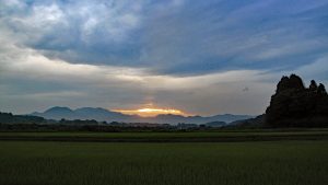 阿武隈の山並みの向こうに一条の光を残したまま