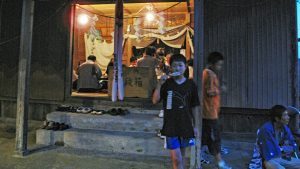 社の中では大人たちがお神酒でほろ酔い、